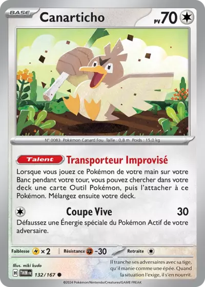 Dans les jeux classiques, Canarticho reste sous sa forme unique sans évolution. À Galar, il adopte le type Combat et peut évoluer en Palarticho. Parmi ses attaques phares figurent Danse-Lames, Coup d’Oignon et Coup d’poireau, des mouvements qui bénéficient de son poireau-utilitaire. Canarticho se distingue aussi par des capacités Vol comme Aéropique et Atterrissage.