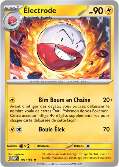 Électrode, numéro 101 dans le Pokédex, est l’évolution de Voltorbe à partir du niveau 30. Surnommé le « Pokémon Balle » ou « Bombe Ball », il ressemble à une Poké Ball inversée (blanc au-dessus, rouge en bas). Électrode est redouté pour son tempérament explosif et sa vitesse fulgurante de 150 en statistique de base, le plaçant parmi les Pokémon les plus rapides de la première génération.
