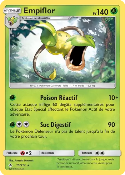 Empiflor porte le numéro #71 dans le Pokédex et appartient à la catégorie des Pokémon Attrape-Mouche. Avec sa couleur verte éclatante marquée de taches et sa large bouche garnie de crocs acérés, ce Pokémon mesure 1,7 mètre pour un poids de 15,5 kg. Il est l’évolution finale de Chétiflor (Bellsprout en anglais) qui évolue en Boustiflor (Weepinbell en anglais) au niveau 21, puis en Empiflor lorsqu’il est exposé à une Pierre Plante. Empiflor conserve le double type Plante/Poison et bénéficie de statistiques d’Attaque et d’Attaque Spéciale équilibrées, lui permettant d’utiliser efficacement des capacités comme Lame-Feuille, Stockage ou Acide. Ses capacités spéciales Chlorophylle (qui double sa Vitesse au soleil) ou Gloutonnerie renforcent son potentiel au combat. Selon le Pokédex, Empiflor attire ses proies avec un liquide au parfum sucré puis les dissout avec un acide puissant dans son corps-urne. Sa longue liane lui permet de capturer des proies à distance, et il peut avaler des créatures entières d’un seul coup.
