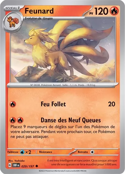 Sa queue est une source de grande énergie vitale, et selon les légendes, arracher une de ses queues provoquerait une malédiction d’un millier d’années. Feunard est réputé pour sa sagesse et sa mémoire exceptionnelle, capable de se rappeler d’événements sur plusieurs siècles. Ce Pokémon maîtrise des attaques Feu puissantes comme Lance-Flammes, Déflagration et Feu Follet, mais apprend également des attaques de type Spectre et Psy, ce qui accentue son aura mythique.