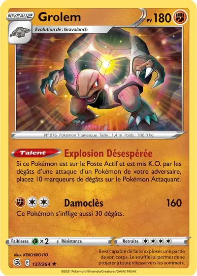 Grolem évolue à partir de Gravalanch par échange entre dresseurs, ou via Fil de Liaison dans certaines versions récentes. Ce Pokémon maîtrise des attaques redoutables telles que Séisme, Lame de Roc, Éboulement, Explosion et Piège de Roc. Il peut également utiliser des techniques défensives comme Boul’Armure et Poliroche pour renforcer sa résistance.