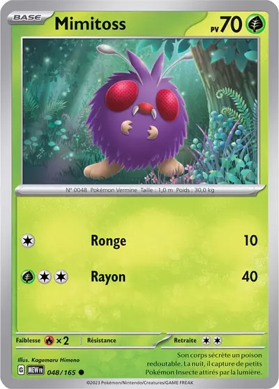 Mimitoss est le Pokémon numéro 48 du Pokédex, de type Insecte et Poison. Il ressemble à une boule couverte de poils violets avec de grandes antennes et de grands yeux composés rouges qui fonctionnent comme un radar, lui permettant de voir dans l’obscurité totale. Il se nourrit d’insectes et est souvent attiré par la lumière la nuit. Mimitoss est connu pour sa fourrure dense qui protège son corps entier et pour ses yeux capables de repérer des proies même minuscules.