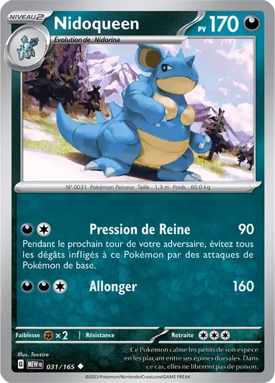 Nidoqueen est connue pour son tempérament protecteur, particulièrement envers les petits de son terrier, qu’elle défend farouchement. Sa carapace est recouverte d’épines qui peuvent sécréter un poison paralysant, et quand elle s’énerve, ces piques se dressent de manière menaçante. Elle utilise toute sa force pour repousser ses ennemis en les chargeant avec puissance.