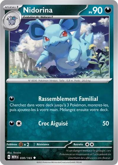 Nidorina est le Pokémon numéro 30 du Pokédex, de type Poison. Elle évolue à partir de Nidoran♀ dès le niveau 16 et évolue ensuite en Nidoqueen par l’utilisation d’une Pierre Lune. Son apparence est celle d’un mammifère bleu tirant vers le blanc, avec des taches bleu foncé sur les pattes arrières et des piques sur le dos. Elle mesure 0,8 m pour un poids de 20 kg et appartient exclusivement au sexe féminin.