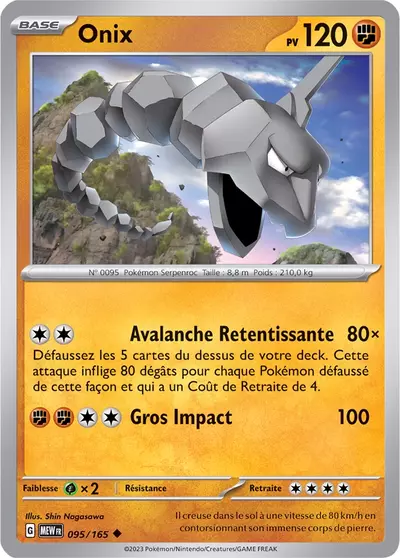 Onix évolue en Steelix avec l’aide d’une Pierre Metal ou via échange avec une Peau Métal. Ses attaques principales incluent Écras’Terre, Jet-Pierres, Tunnel, Séisme et Queue de Fer, qui profitent de sa puissance défensive et de son gabarit. Avec 110 PV sur certaines versions récentes de cartes comme Promo-A ou Puissance Génétique, Onix a une solidité et un coût de retraite élevé, mais contrebalance avec des capacités de blocage et de dégâts massifs.