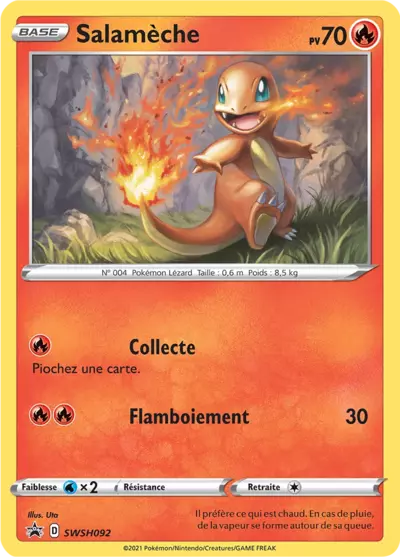 Salamèche est un Pokémon de type Feu, emblématique comme l’un des Pokémon de départ de la première génération dans la région de Kanto. Il se distingue par son corps orange vif et la petite flamme éternelle qui brûle au bout de sa queue. Cette flamme est un indicateur vivant de la santé et de l’humeur de Salamèche : plus elle brûle intensément, plus Salamèche est en forme et heureux, tandis qu’une flamme faible ou tremblotante indique qu’il est faible ou triste. Si la flamme s’éteint, Salamèche meurt car c’est son unique moyen de régulation thermique.